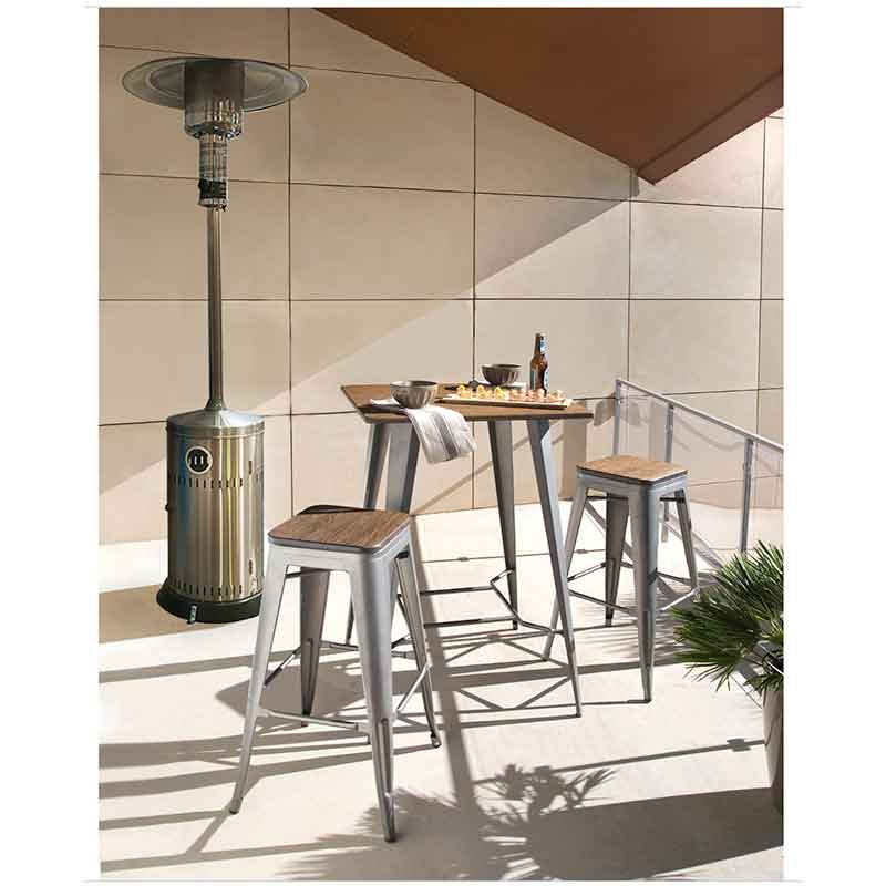 Estufa de acero inoxidable ideal para la intemperie, en acabado cromado. Combustible gas butano/propano. Está diseñada para calentar superficies de hasta 10 m² y con una autonomía de 12 horas. Recomendado exclusivamente para espacios bien ventilados. Tiene una eficiencia radiante del 92% calentando el objeto y no el ambiente. Medidas: 56 cm de ancho.