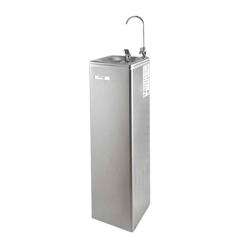 Dispensador de agua filtrada. El agua se sirve fría y los surtidores se accionan mediante pulsadores manuales en los grifos