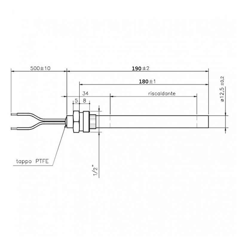 Con racor roscado de 1/2″; diametro 12,5mm; longitud total 190mm; longitud hasta la rosca 180mm; 450Watt.