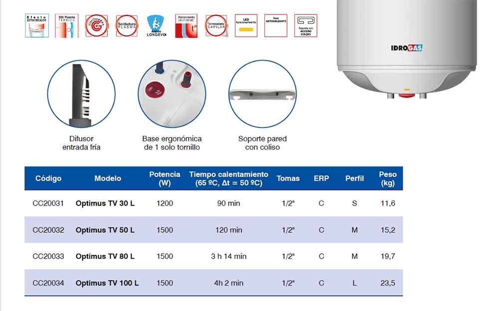 Los termos eléctricos IDROGAS OPTIMUS, van de 30 a 100 L. Los modelos TV son una gama para su instalación en vertical.