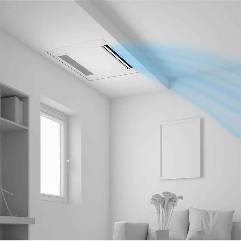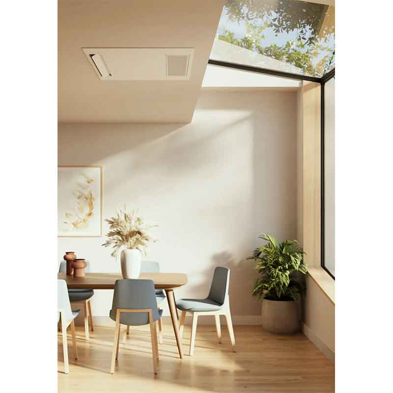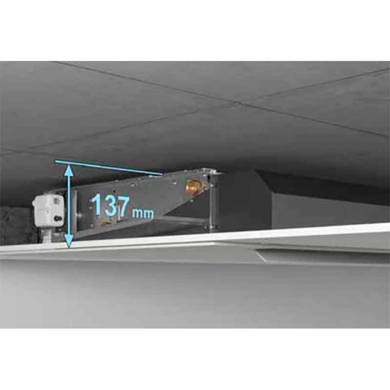 Su instalación en el techo, se integra perfectamente en cualquier ambiente y, con su altura reducida, es ideal incluso donde los falsos techos dejan poco espacio.